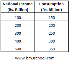 The above table shows that when national income is Rs. 100 billion the national consumption is Rs. 150 billion. When national income rises from Rs. 100 billion to Rs. 200 billion the consumption also rises from Rs. 150 billion to Rs. 200 billion. When national income further rises from Rs. 200 billion to Rs. 300 billion the national consumption also rises from Rs. 200 billion to Rs. 250 billion. This is showing the relationship between income and consumption which is called consumption function.